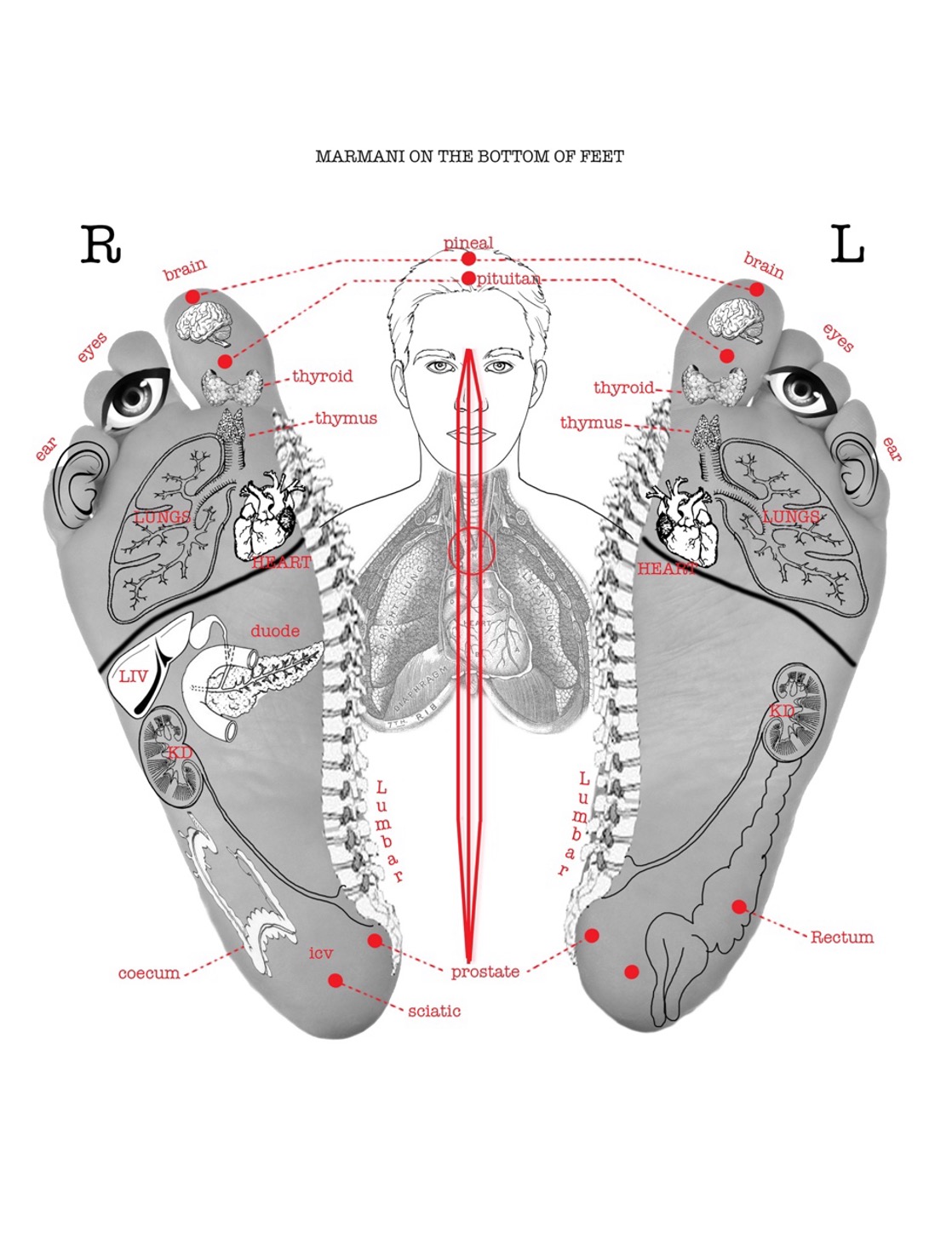 Below are some important points to consider located at the bottom of our feet. Also, a clear illustration of where the areas of our body are reflected on the feet.